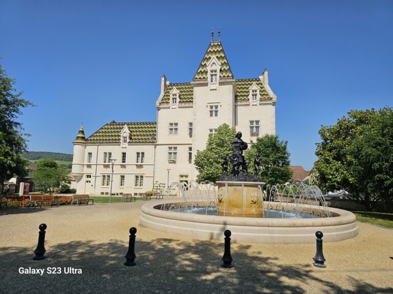 Je fais halte à Meursault, rendu célèbre par le film La Grande Vadrouille : la mairie y faisait office de Kommandantur ! Aujourd’hui encore, les visiteurs s’y pressent pour photographier cette façade emblématique. Mais Meursault ne se résume pas à son clin d’œil au cinéma : ses ruelles et ses domaines viticoles méritent le détour