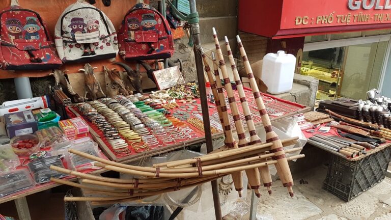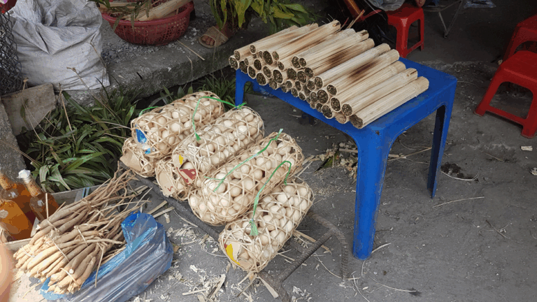Au bord de la route, de simples tables en plastique accueillent une étonnante variété de produits : bouteilles de miel, racines médicinales ou aromatiques, œufs de canard soigneusement rangés dans des paniers de bambou… et surtout ces mystérieux tubes de bambou empilés en pyramide.