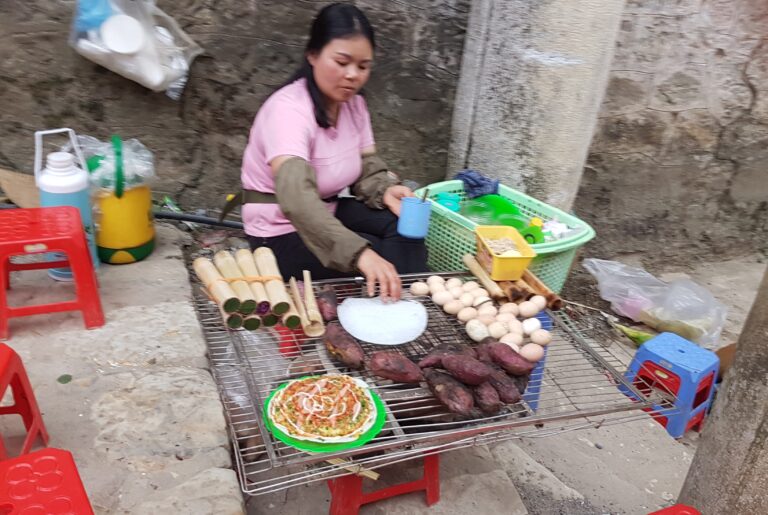 Ils renferment une spécialité appelée cơm lam : du riz gluant cuit à même le bambou, parfois parfumé au lait de coco ou accompagné de haricots. Les voyageurs achètent un tube, l’ouvrent en cassant l’écorce de bambou, et dégustent directement ce riz moelleux et légèrement fumé. Simple, nourrissant, mais surtout chargé de traditions, le cơm lam est typique des régions de montagnes, notamment autour de Sapa et des minorités ethniques.